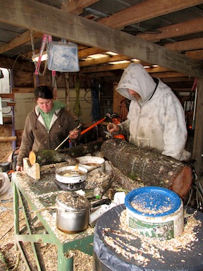 | With icy weather outside, Nichole and John inoculate shiitake mushroom logs inside the work shed.