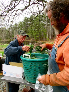 | Cole, Bobby, and John pack collard greens into bags on Friday to sell at market on Saturday.